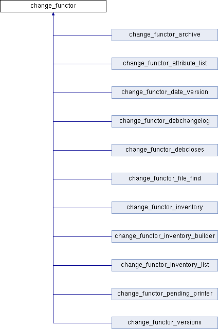 Implemented in change_functor_inventory, change_functor_archive, change_functor_inventory_builder, change_functor_pending_printer, change_functor_attribute_list, change_functor_file_find, change_functor_inventory_list, change_functor_date_version, change_functor_versions, change_functor_debcloses, and change_functor_debchangelog.